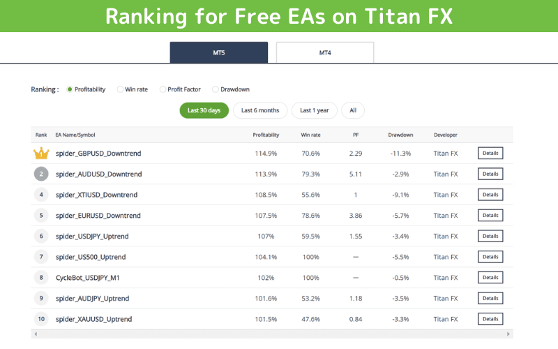 Titan FXでは、MT4およびMT5向けに無料で多数のEAを提供しており、過去のデータを確認した上で使用することが可能です。