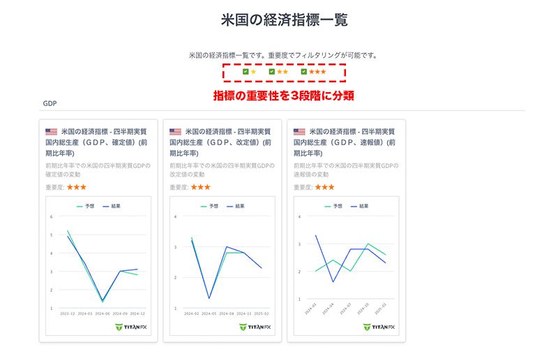 経済指標は、影響度に応じて1〜3つの星でランク付けされています。星の数が多いほど、市場への影響が大きいことを示します。
