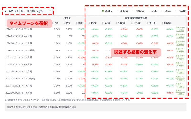 また、右側では、経済指標の発表後に主要資産の価格変動を確認できます。対象となる資産には、USDJPY、EURUSD、XAUUSD、US30、US500、NAS100 などが含まれ、市場の反応を効率的に分析できます。