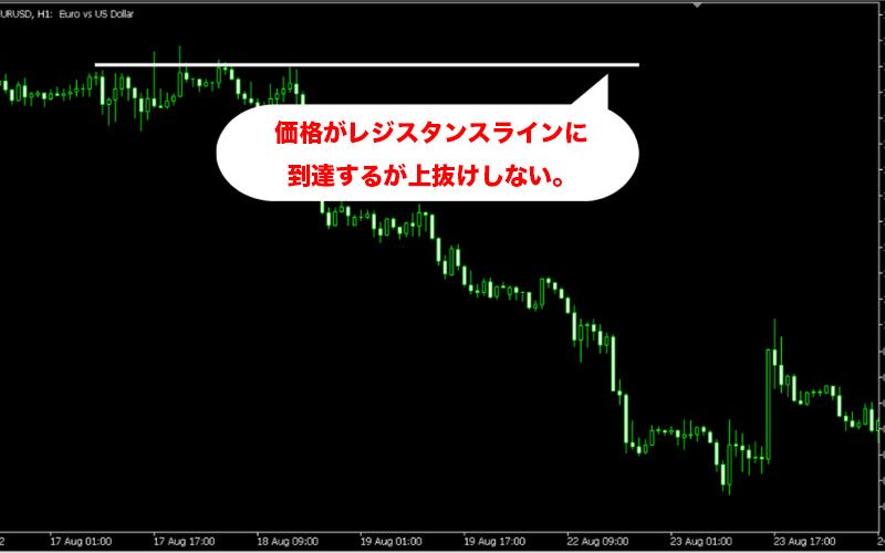 例えば、EUR/USDの1時間足チャートでは、直近の2つの高値を結ぶことでレジスタンスラインを描くことができます。価格がこのレジスタンスラインに触れると、通常、上昇が止まり下落へ転じることが多く、このラインが現在の市場における有効なレジスタンスレベルであると考えられます。