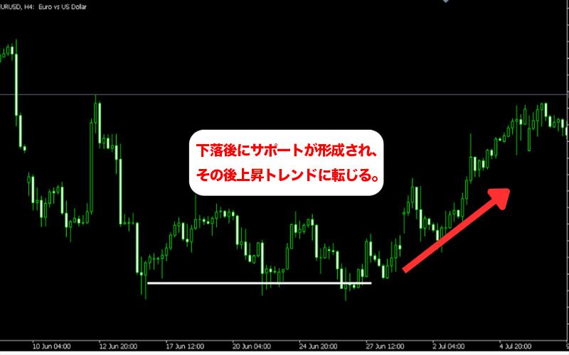 サポートラインは、支持線 や サポートレベル とも呼ばれ、さらなる価格下落を抑制する役割を果たします。