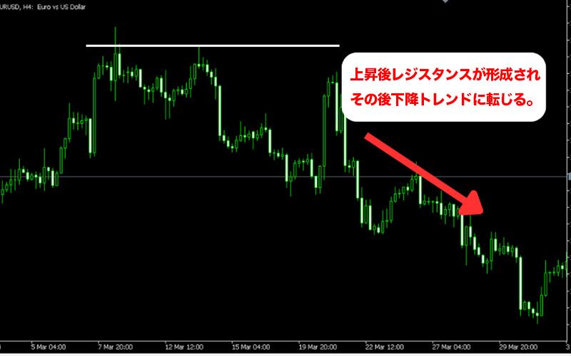 レジスタンスとは、価格が上昇を止め、反落することが期待される水準を指します。この水準は、通常、価格チャート上の高値によって形成されます。