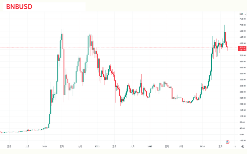 2024年半ば時点で、BNBの価格は引き続き変動しています。6月には最高値の718ドルを記録した後、若干の調整が見られました。最近の価格は550ドル~600ドルの範囲で推移しています。