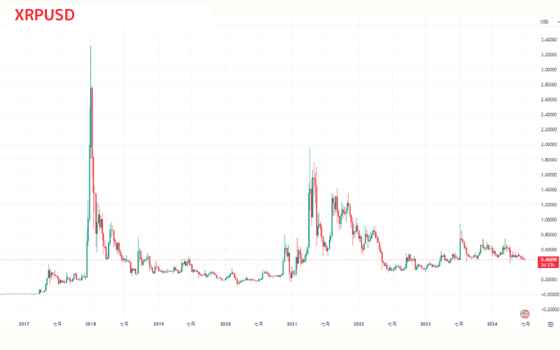 2022年のXRP価格は$0.3~$0.5の範囲で安定して推移しました。そして、2023年7月、米国の裁判所がXRPが証券ではないと判断したことで、価格は73%急騰し、$0.8162に達しました。その後、価格は$0.5以上で安定しました。