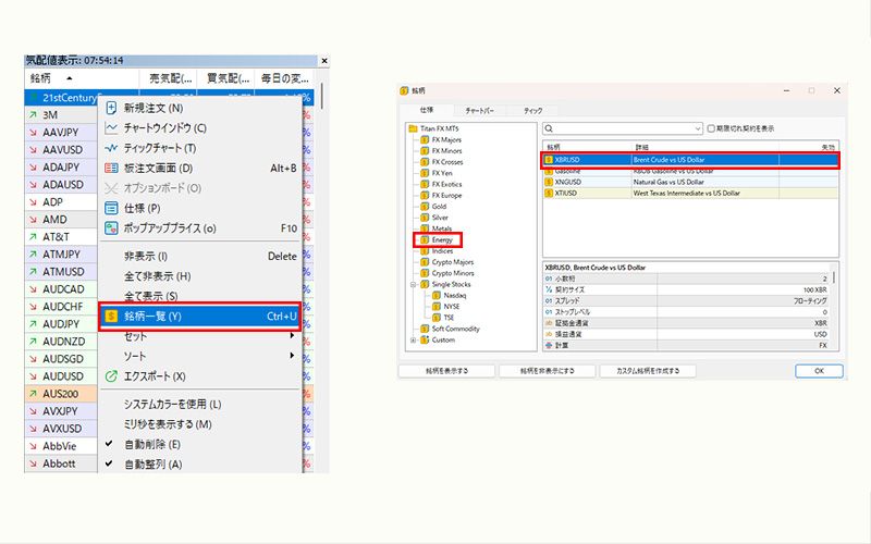 「気配値表示」ウィンドウで右クリックし、「銘柄」を選択。次に「Energy」をダブルクリックし、「XBR/USD」を追加します。
