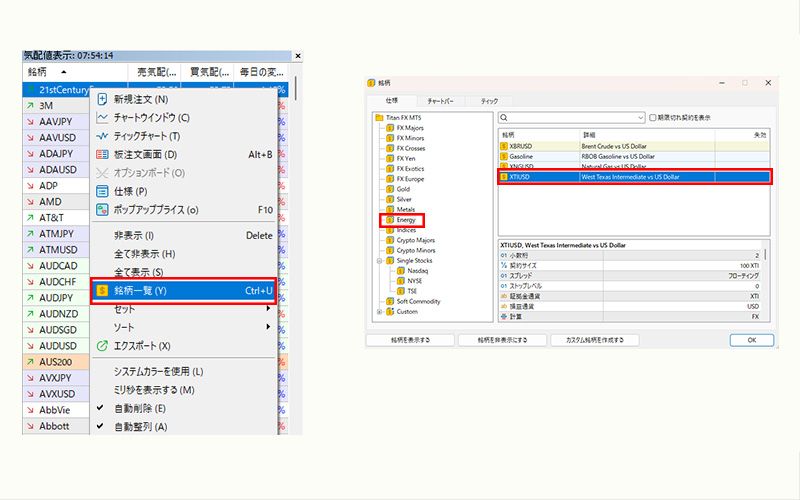 「気配値表示」ウィンドウ内で右クリックし、「銘柄」をクリック。次に「energy」をダブルクリックし、「XTI/USD」を選択してWTI原油の価格を表示します。