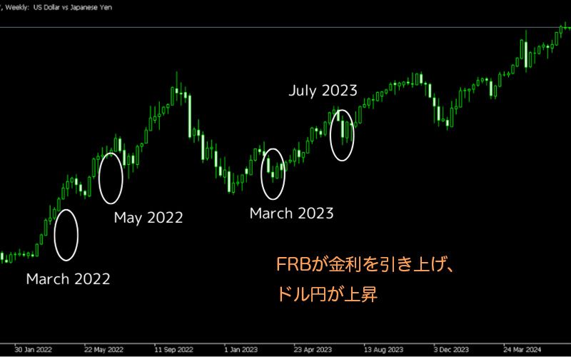 米連邦準備制度(FRB)が金利引き上げを発表すると、通常は米ドル(USD)の価値が上昇します。これは、金利が高いと投資資金が集まり、USDの需要が増えるためです。