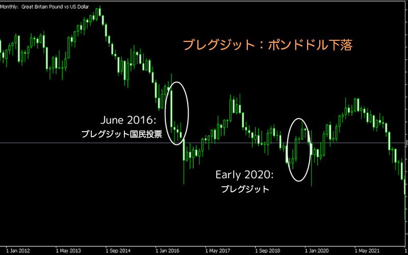 2016年6月23日、イギリスではEU離脱(ブレグジット)を問う国民投票が実施されました。結果は52%が離脱に賛成で、イギリス経済の先行きに対する不透明感が一気に高まり、ポンドが急落しました。GBP/USDは1.48から1.32へと下落し、1985年以来の最安値を記録しました。