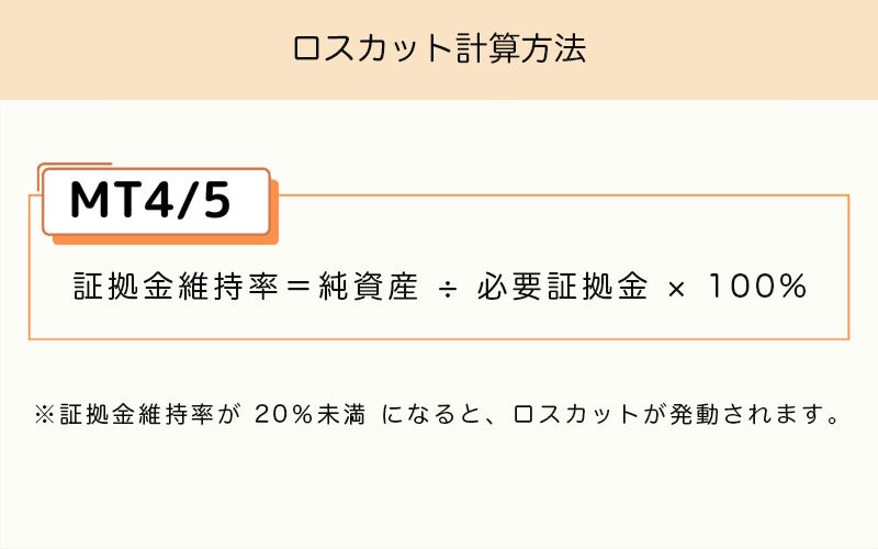 Titan FXのロスカット水準(証拠金維持率)は20%です。トレーダーの証拠金維持率が20%を下回ると、ロスカットが発動されます。