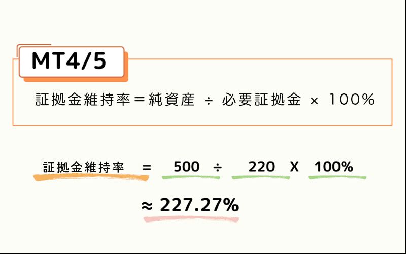 証拠金維持率 = 500(純資産) ÷ 220(証拠金) × 100% ≈ 227.27%
