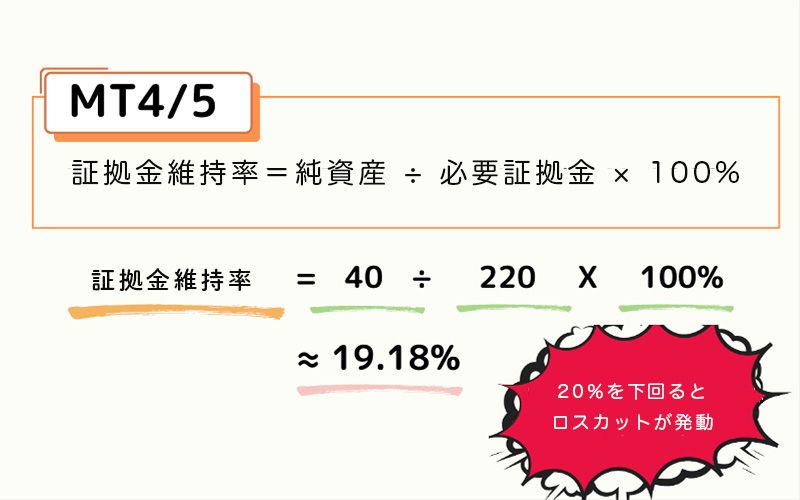 証拠金維持率 = 40(純資産) ÷ 220(証拠金) × 100% ≈ 19.18%