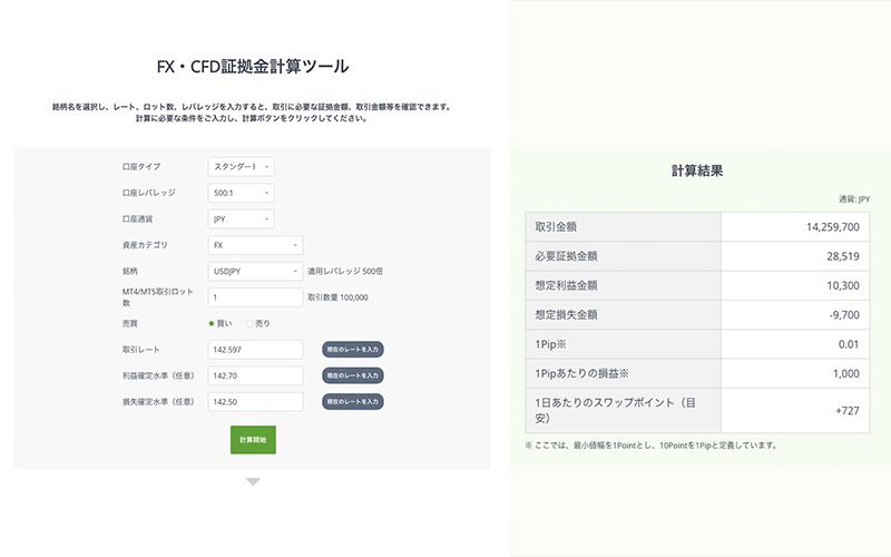 Titan FXでは、「Forex/CFD証拠金計算機」を提供しており、証拠金維持率を自動で計算できます。取引通貨、価格、ロットサイズ、レバレッジを入力するだけで、必要証拠金と取引金額を確認できます。誰でも簡単に利用可能です。
