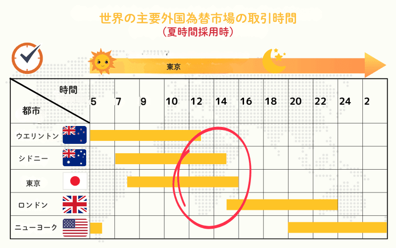 また、日本はサマータイム(夏時間)を採用していないため、東京セッションの時間帯は年間を通じて固定されています。