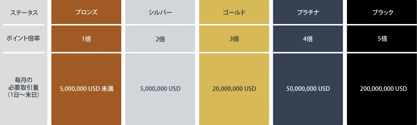 最初は「ブロンズ」からスタートし、取引実績を積み上げることで最上位の「ブラック」を目指せます。ブラックステータス到達時には、ブロンズに比べて圧倒的なスピードでポイントが蓄積されます。
