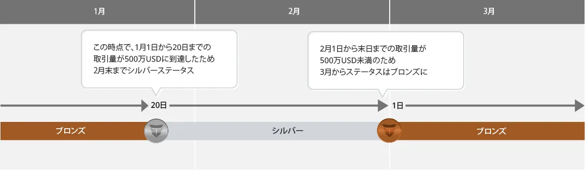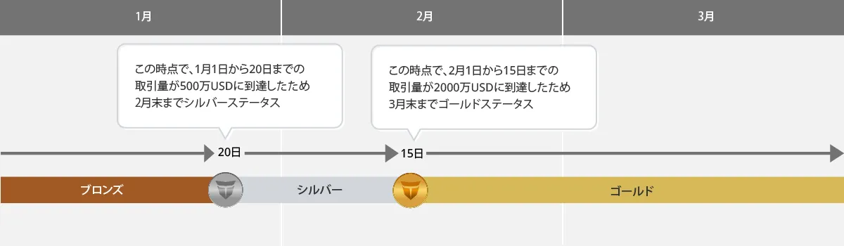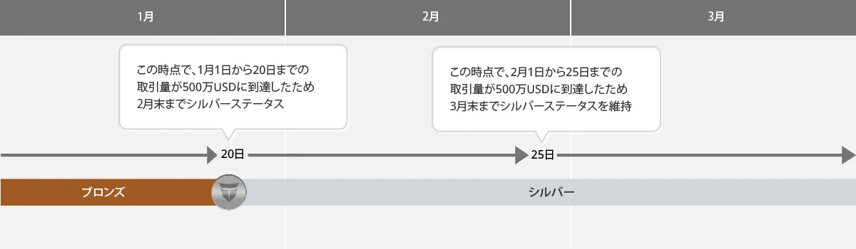 毎月1日〜月末までの取引量で判定され、翌月1日から適用されます。万が一、取引量が基準に満たなかった場合でも、ステータスが下がるのは一度に1段階のみです。取引をお休みした月があっても、一気に複数のステータスが下がることはありません。