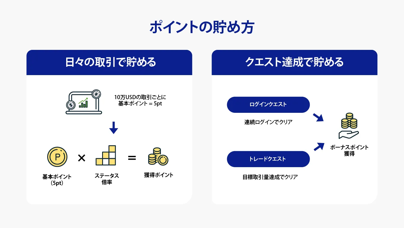 通常の取引で獲得できるポイントに加えて、ゲーム感覚で楽しめる「クエスト」を達成することでボーナスポイントを獲得できます。内容は、「クライアントキャビネットにログインする」といった手軽なものから、「目標の取引量を達成する」など、日々の取引のついでに取り組めるものが中心です。