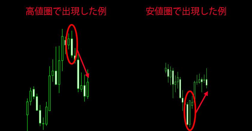 高値圏のときは、前の足の高値を超えたにも関わらず、前の足の安値を割り込んで終了する足が出現したときが該当します。