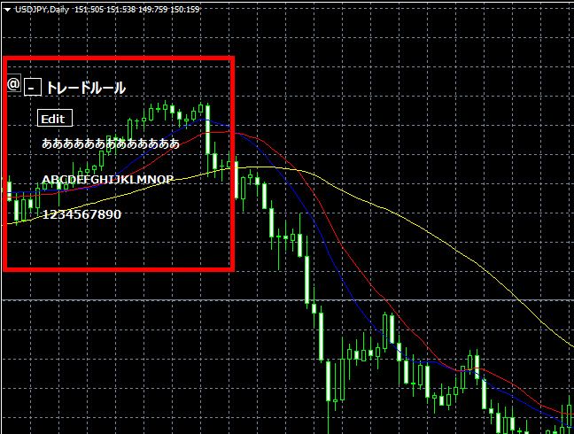 このインジケーターは、チャート上に任意のテキストを表示できるツールです。トレードルールや戒めを備忘として表示したり、トレード日誌の作成時に活用するなど、多用途でご使用いただけます。
