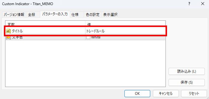 | タイトル | メモのタイトルを設定します。同じ名前にすると他のチャートで反映させることもできます。 | SampleTitle |