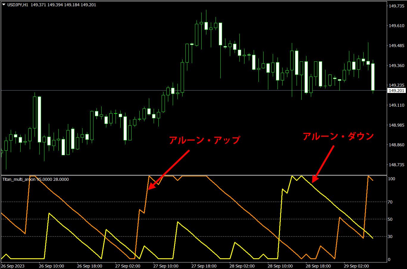 アルーンとは、サブチャートにアルーン・アップとアルーン・ダウンと呼ばれる2本のラインを表示して分析を行うインジケーターです。