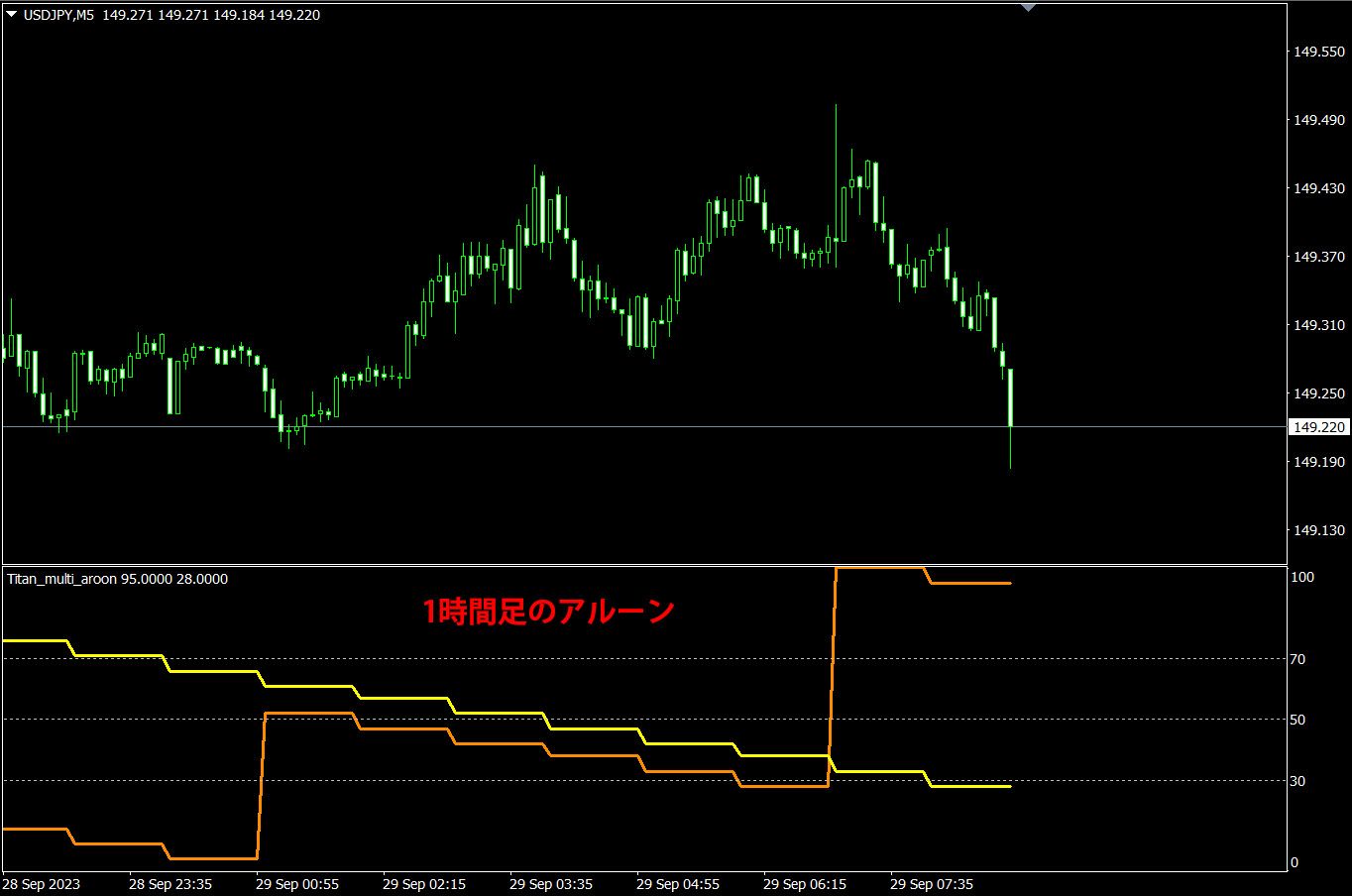 【ドル円の5分足に1時間足のアルーンを表示させた例】