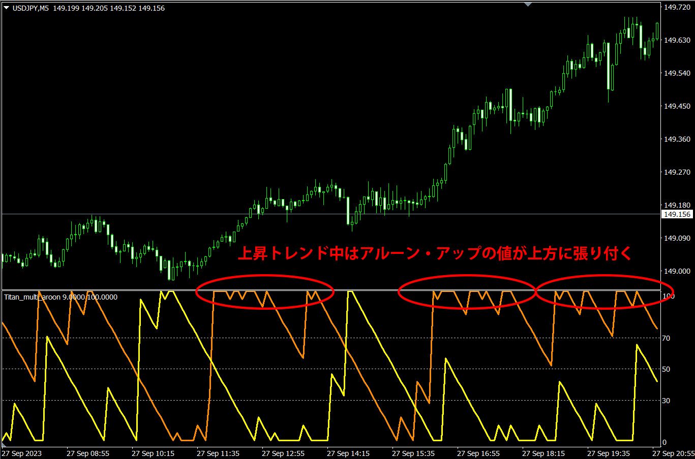 アルーン・アップが上に張り付く状態が続くときは、期間内に高値の更新が続くような状態であるため、上昇トレンド、アルーン・ダウンが上に張り付く状態が続いているときは、期間内に安値を更新する動きが続いているため、下降トレンドと判断することができます。