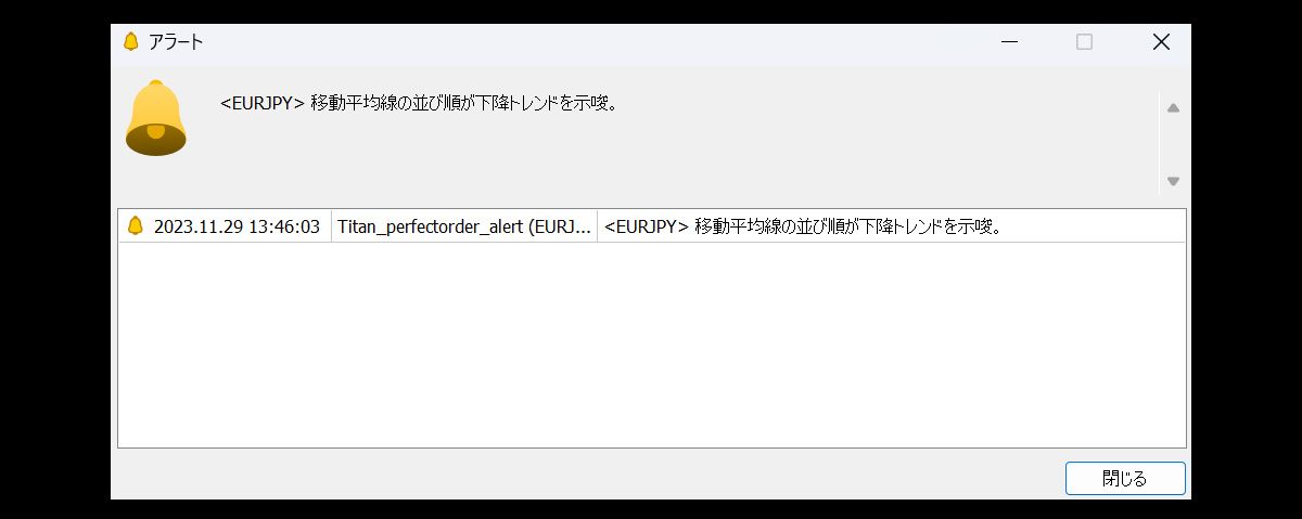 | アラートの設定 | アラートを設定するかを指定します。trueの場合は矢印の発生をアラートで告知します。 | false |