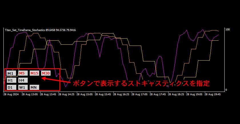 このインジケーターはMT4/MT5のチャートの下部に複数の時間足のストキャスティクスを表示できます。