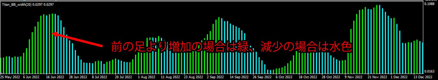 シンプルなライン表示のほか、ヒストグラム(棒グラフ)で表示することもでき、この場合は、前の足からの増減で色が変わる仕様なので、バンド幅の収縮状況を把握しやすくなります。