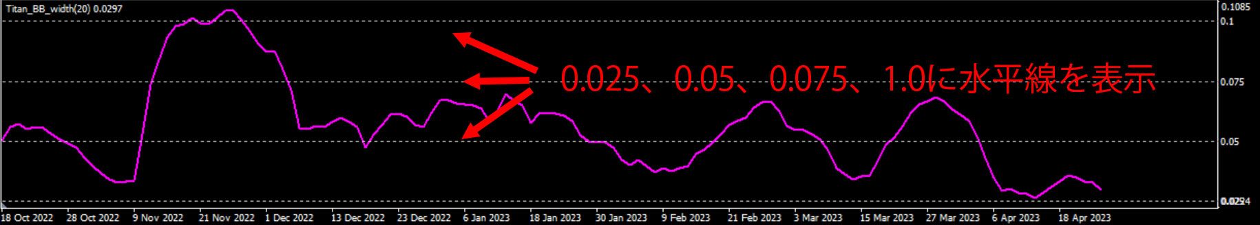通常のボリンジャーバンドでは細かいバンド幅の変化の確認は難しいですが、このインジケーターを使用すると、バンド幅の変化を効率的に確認できます。