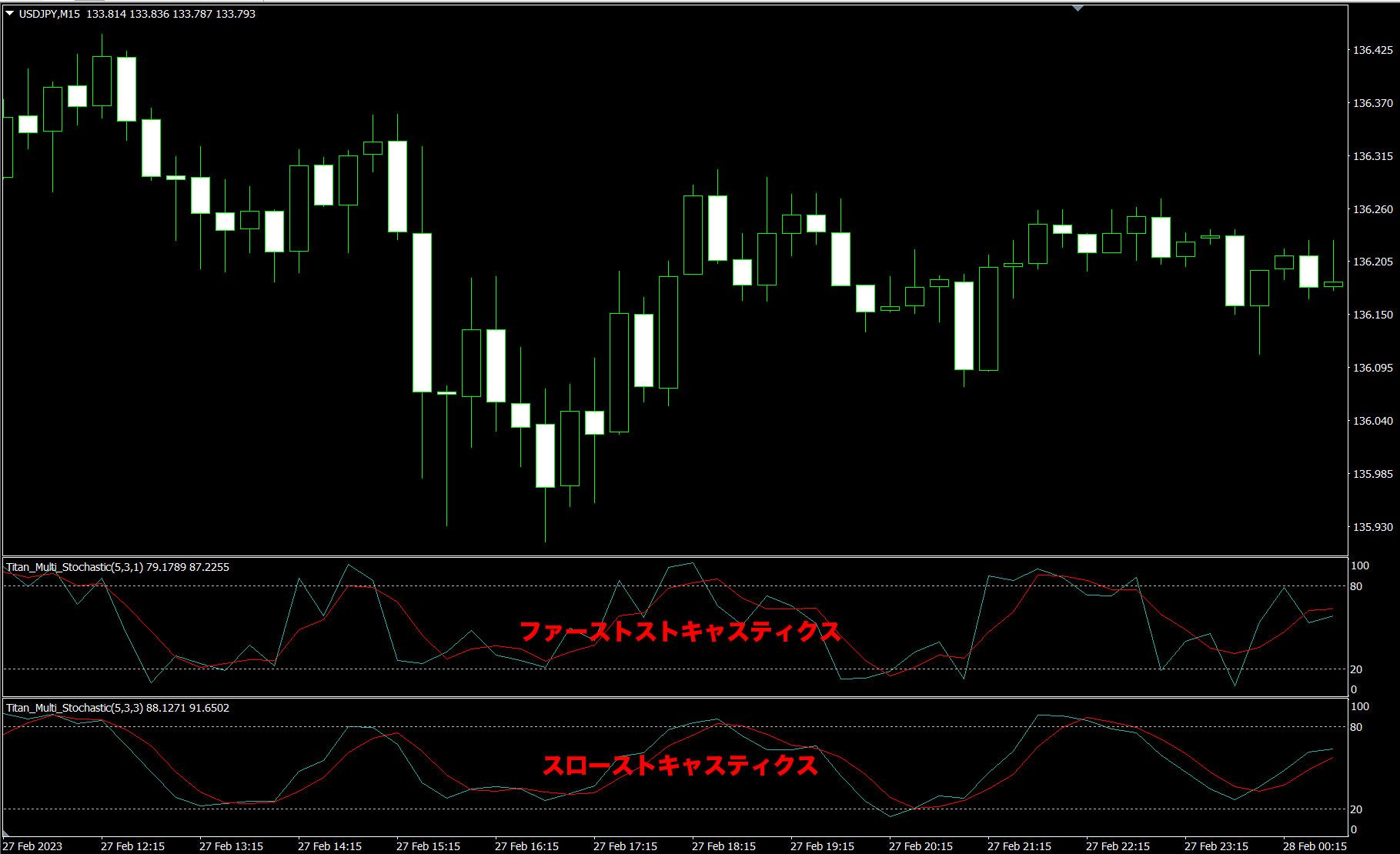 【1時間足のチャートに4時間足のストキャスティクスを表示させた例】