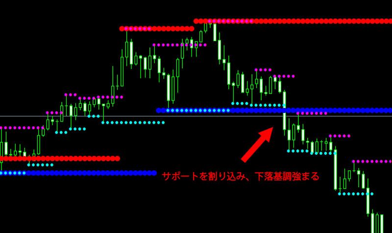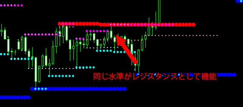 フラクタルで算出された短期、中期、長期の3つの期間の時間足のチャートのサポート、レジスタンスの水準をドットで表示するインジケーターです。