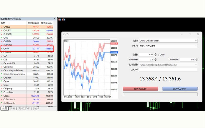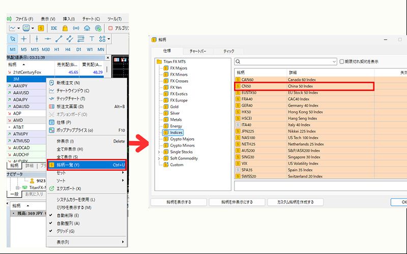 「気配値表示」ウィンドウ内で右クリックし、「銘柄一覧」を選択。その後「指数」セクション内の「CN50」をダブルクリックして、表示させます。