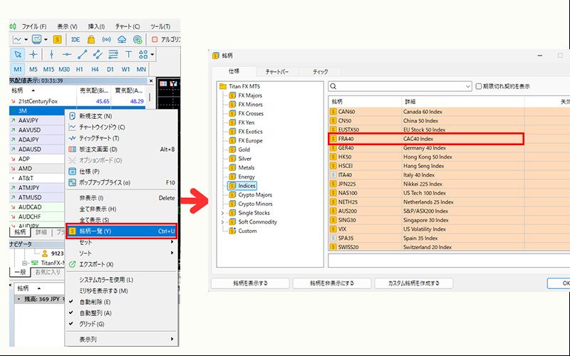 「気配値表示」ウィンドウで右クリックし、「銘柄一覧」を選択して「indices」をダブルクリックします。「FRA40」を選択すると、CAC40指数の価格が「気配値表示」ウィンドウに表示されます。