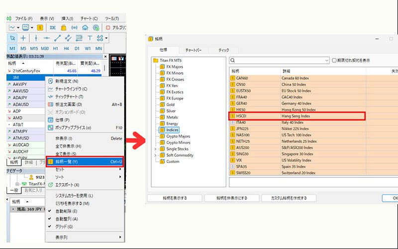 Titan FXの取引口座を開設後、MT4またはMT5プラットフォーム上でH株企業指数(HSCEI)のCFDを取引できます。