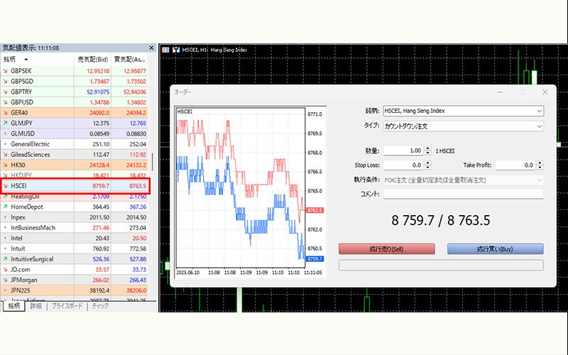 追加後、価格をダブルクリックまたはHSCEIチャートを開いて取引開始。