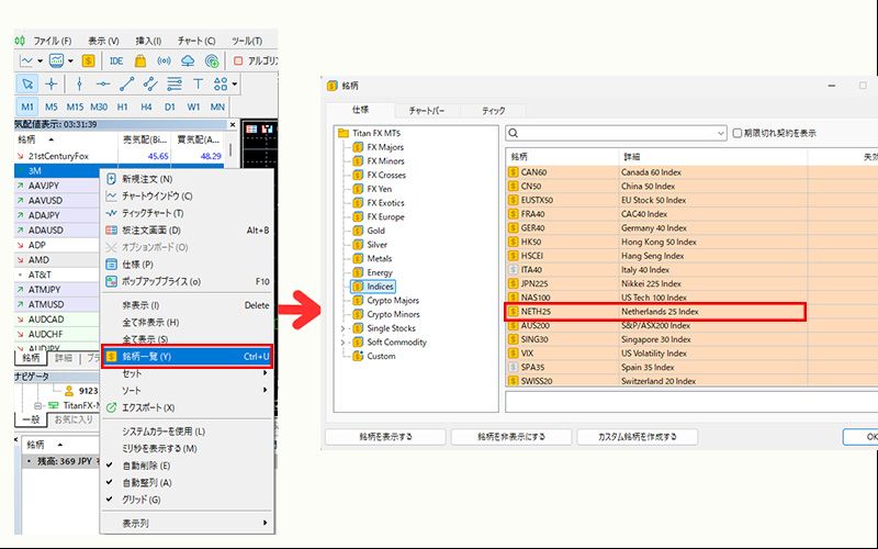 「気配値表示」ウィンドウで右クリックし、「銘柄一覧」を選択後、「indices」内の「NETH25」をダブルクリックして、NETH25指数の価格を表示させます。