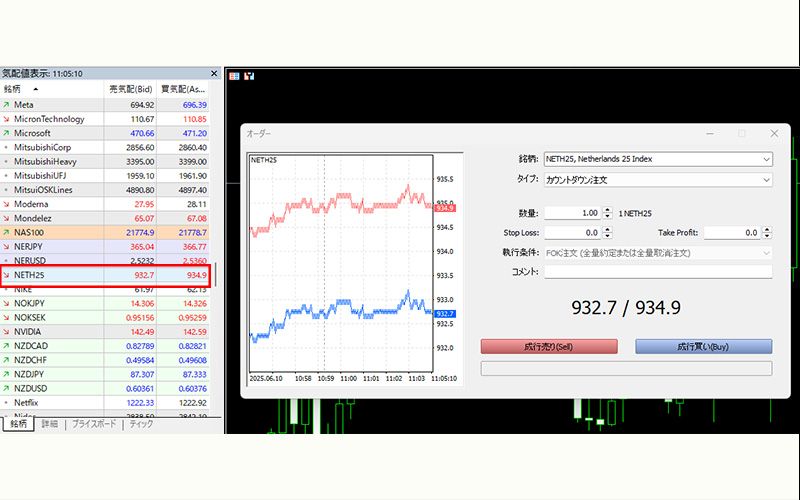 NETH25の価格をダブルクリックするか、チャートを開いて取引を開始できます。