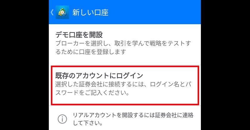続いて、「既存のアカウントにログイン」をタップします。
