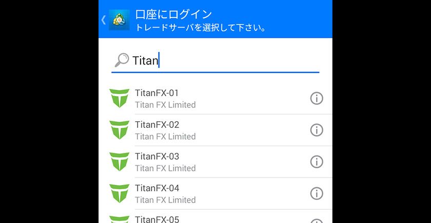 「証券会社を検索」の欄に「Titan」と入力し、表示されるサーバーのリストから該当するサーバを選択します。