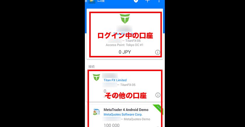 上段に現在ログインしている口座情報が表示され、下段にその他の登録されている口座が表示されます。この中から、ログインしたい口座をタップすると、ログインするアカウントを切り替えることができます。