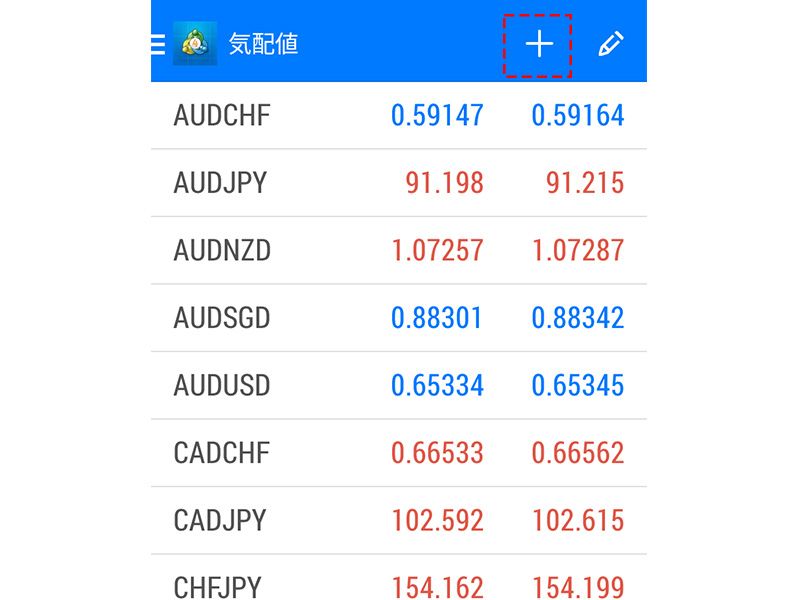 気配値表示画面の上部の「+」をタップすると、銘柄の追加画面に遷移します。