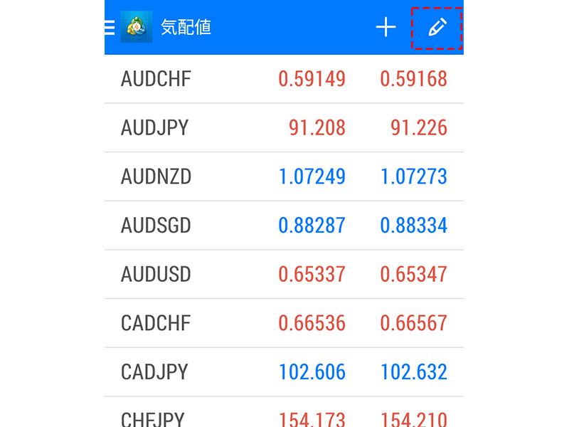 気配値表示画面の右上のペンのマークをタップすると、現在表示している銘柄の一覧が表示されます。
