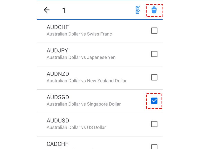 画面右上のゴミ箱のマークをタップし、削除したい銘柄の右に表示されるチェックボックスにチェックを入れ、再度ゴミ箱マークをタップすると、非表示に切り替えることができます。