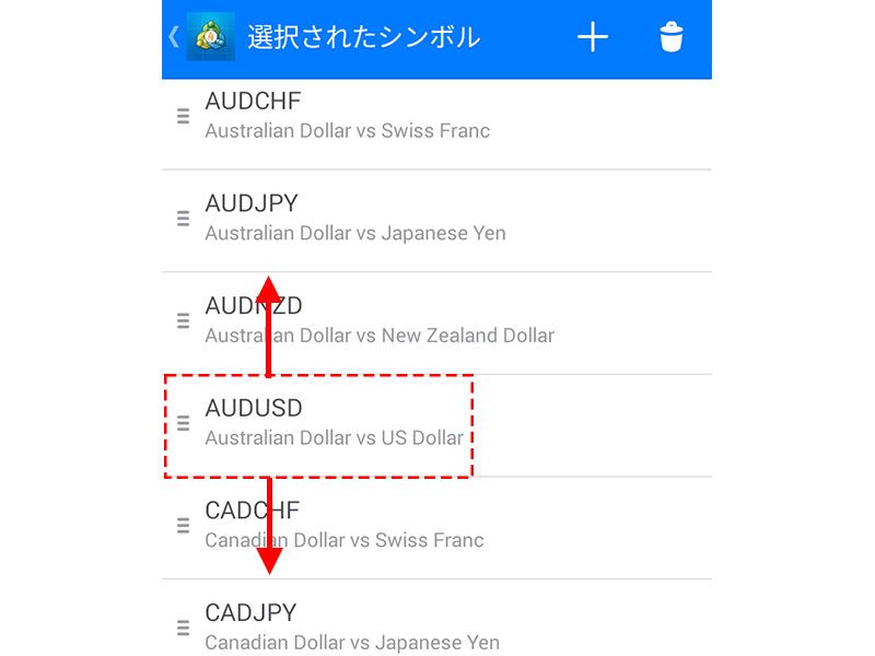 表示の順序の変更も気配値表示右上のペンマークをタップした画面で行います。銘柄名を上下にドラッグすると、表示する順序を変更することができます。