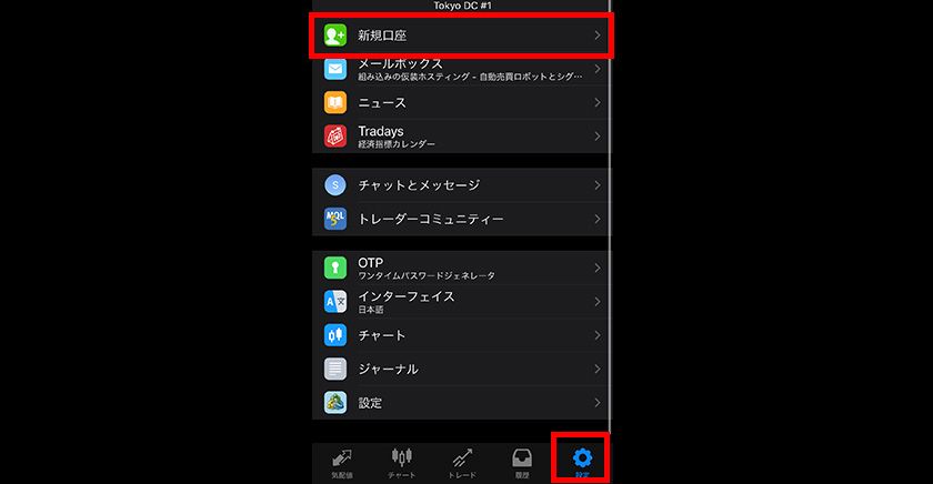 口座を追加する場合は、下部のメニューの「設定」から「新規口座」をタップします。