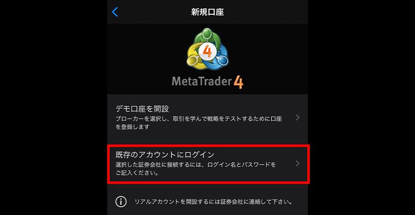 iOS版のMT4は複数のアカウント(口座)を登録しておき、自由に切り替えて使用することができます。