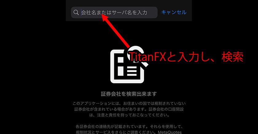 「会社名またはサーバ名を入力欄に「TitanFX」と入力し、サーバを検索し、該当するサーバを選択します。