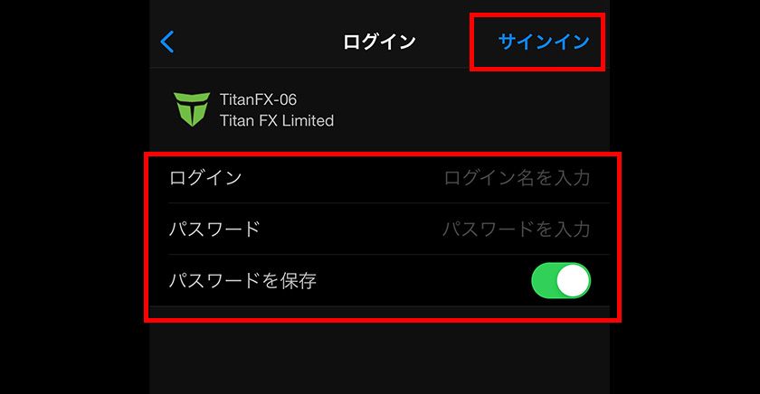 続いて、追加したい口座の「ログイン(ログインID)」、「パスワード」を入力し、「パスワードを保存」をONにした状態で右上の「サインイン」をタップすると、ログインし、口座情報が登録されます。