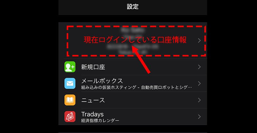 下部のメニューで「設定」を選択し、一番上に表示される現在ログインしている口座の情報が記載されている部分をタップします。